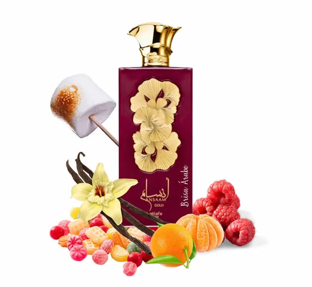 Ansaam gold Perfume delicioso y elegante que tiene la particularidad de oler a una nota que no está declarada, el malvavisco (nubes de chuches). Es dulce y afrutado. Este perfume es del estilo Oriana. Tamaño: 100ml.