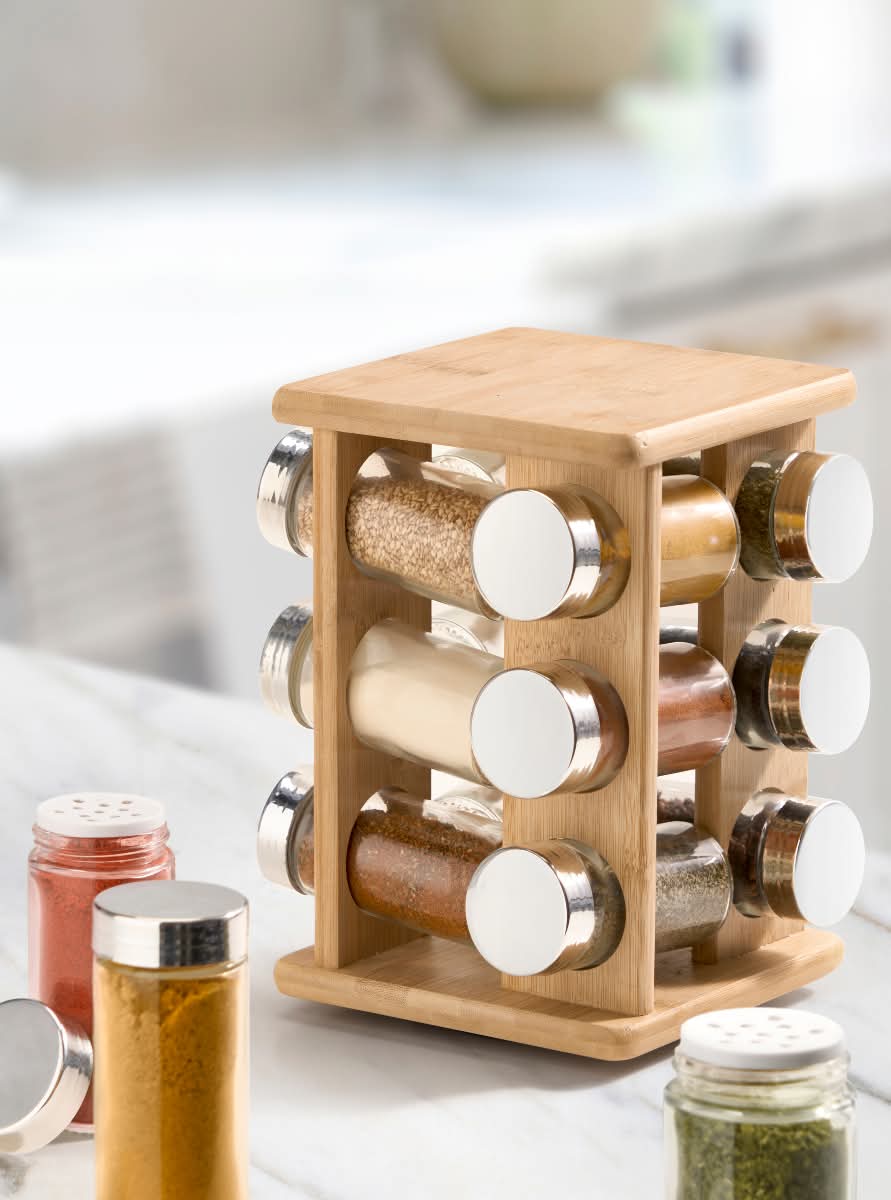 especiero giratorio de bambú con 12 botes de vidrio es un imprescindible para cualquier hogar.