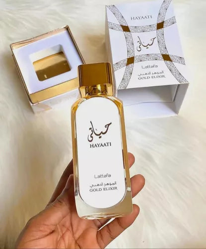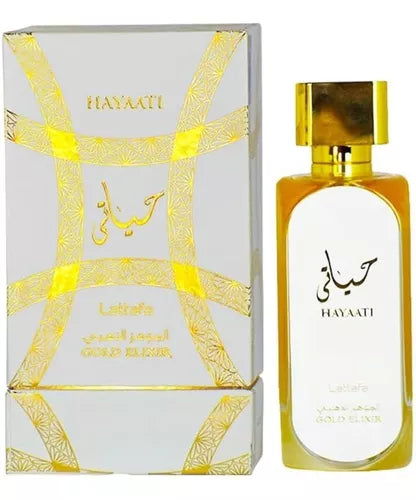Hayaati Gold Elixir de Lattafa Perfumes es una fragancia de la familia olfativa para Hombres y Mujeres. Las Notas de Salida son bergamota, toronja (pomelo) y casis (grosellero negro); las Notas de Corazón son cuero, durazno (melocotón) y azafrán; las Nota