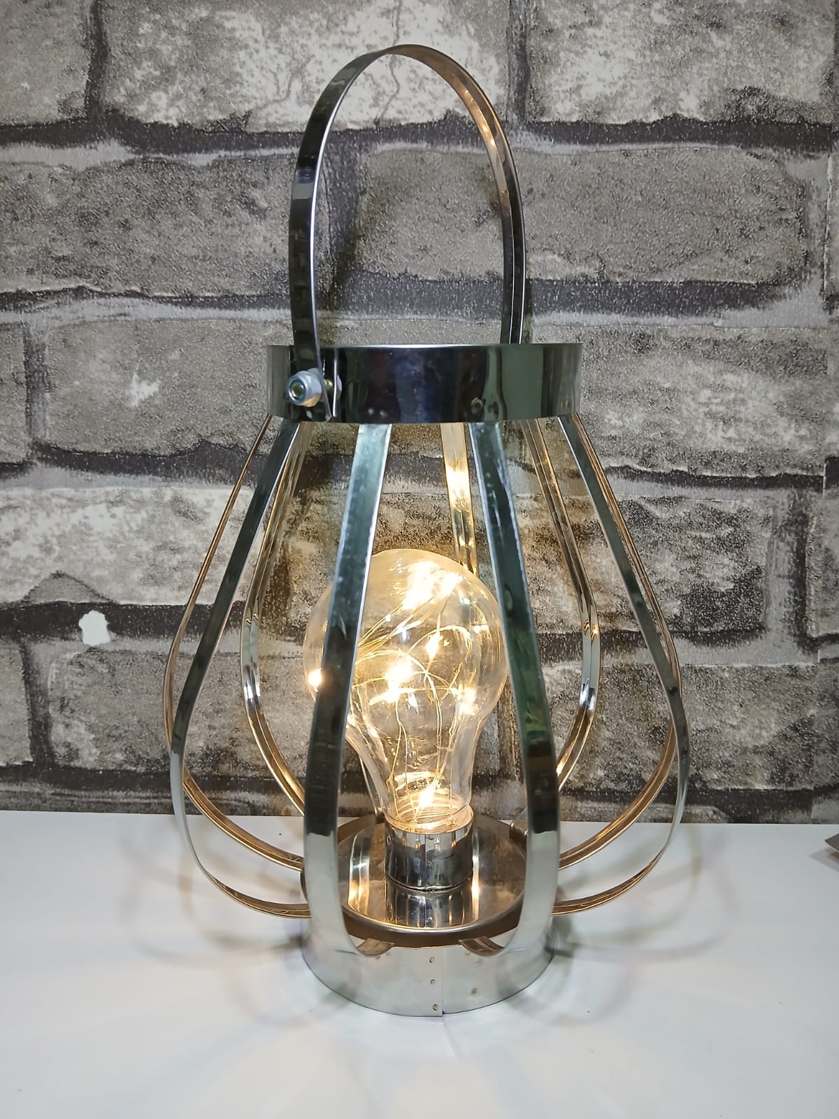 Lámpara de mesa LED con jaula metálica geométrica urbana – moderna, cromada, decorativa, sin cable, con batería, para escritorio, mesita de noche, salón, hogar o jardín (Plateado con asa).