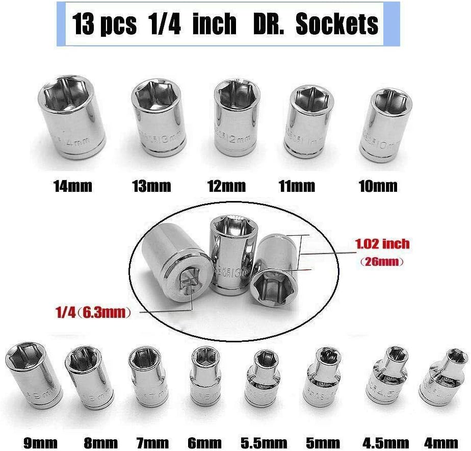 Juego de enchufes versátil: juego de enchufes hexagonales de 13 piezas de 1/4 pulgadas con tamaños que van desde 4 mm a 14 mm, incluyendo una junta universal para mayor flexibilidad
