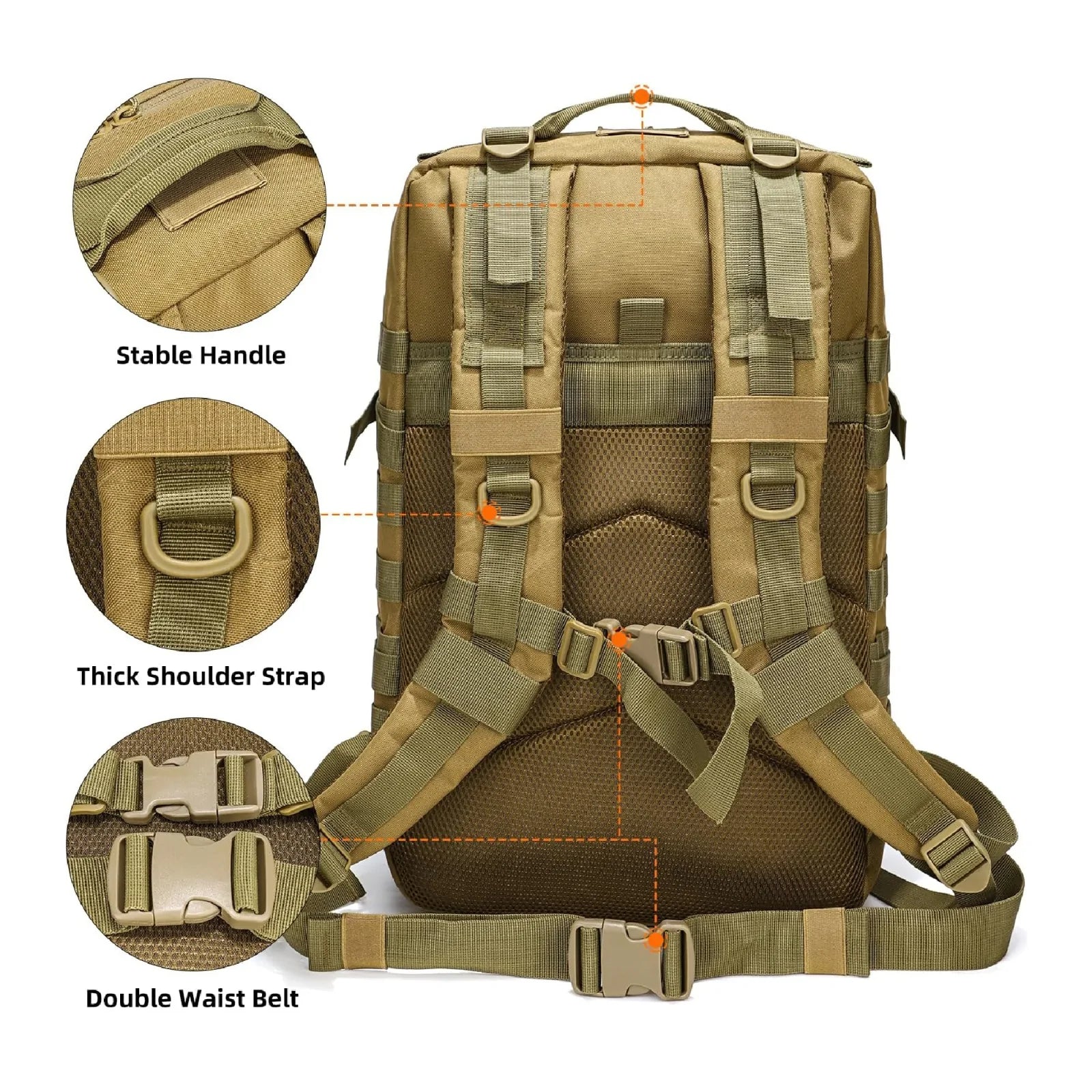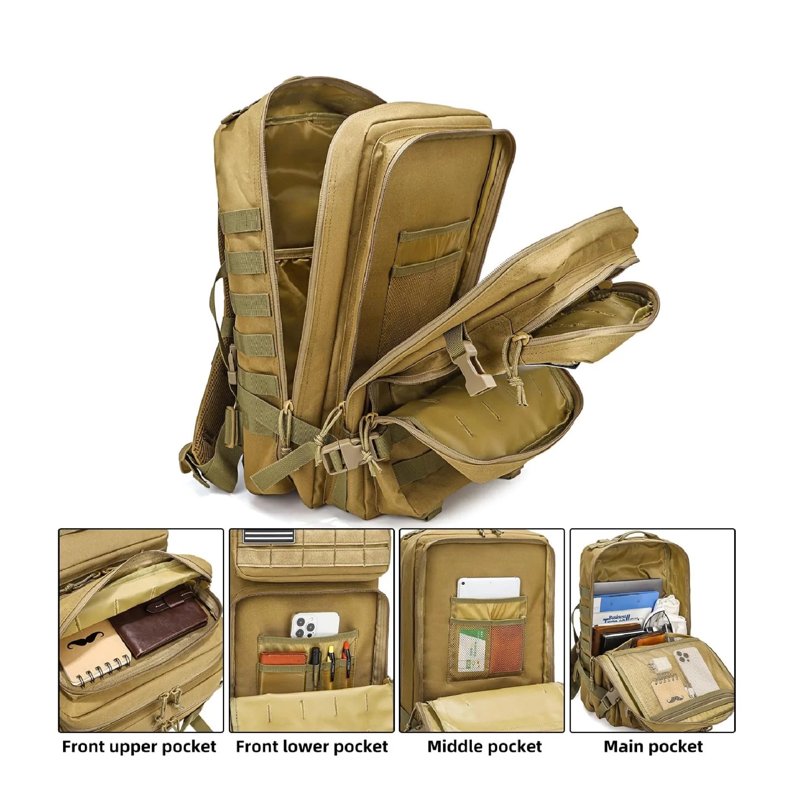 Mochila de combate con sistema Molle . Cuenta con dos compartimentos principales. En la parte frontal dispone de dos bolsillos con cierre de cremallera. En la parte posterior dispone de un bolsillo de tamaño mediano con cierre de cremallera. El respaldo es acolchado y transpirable.