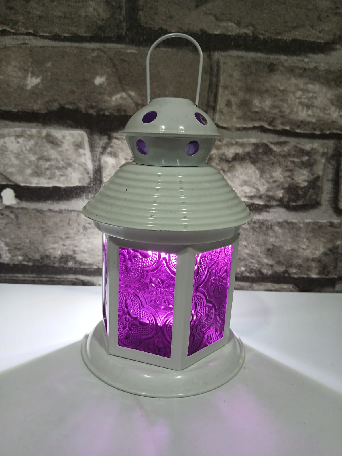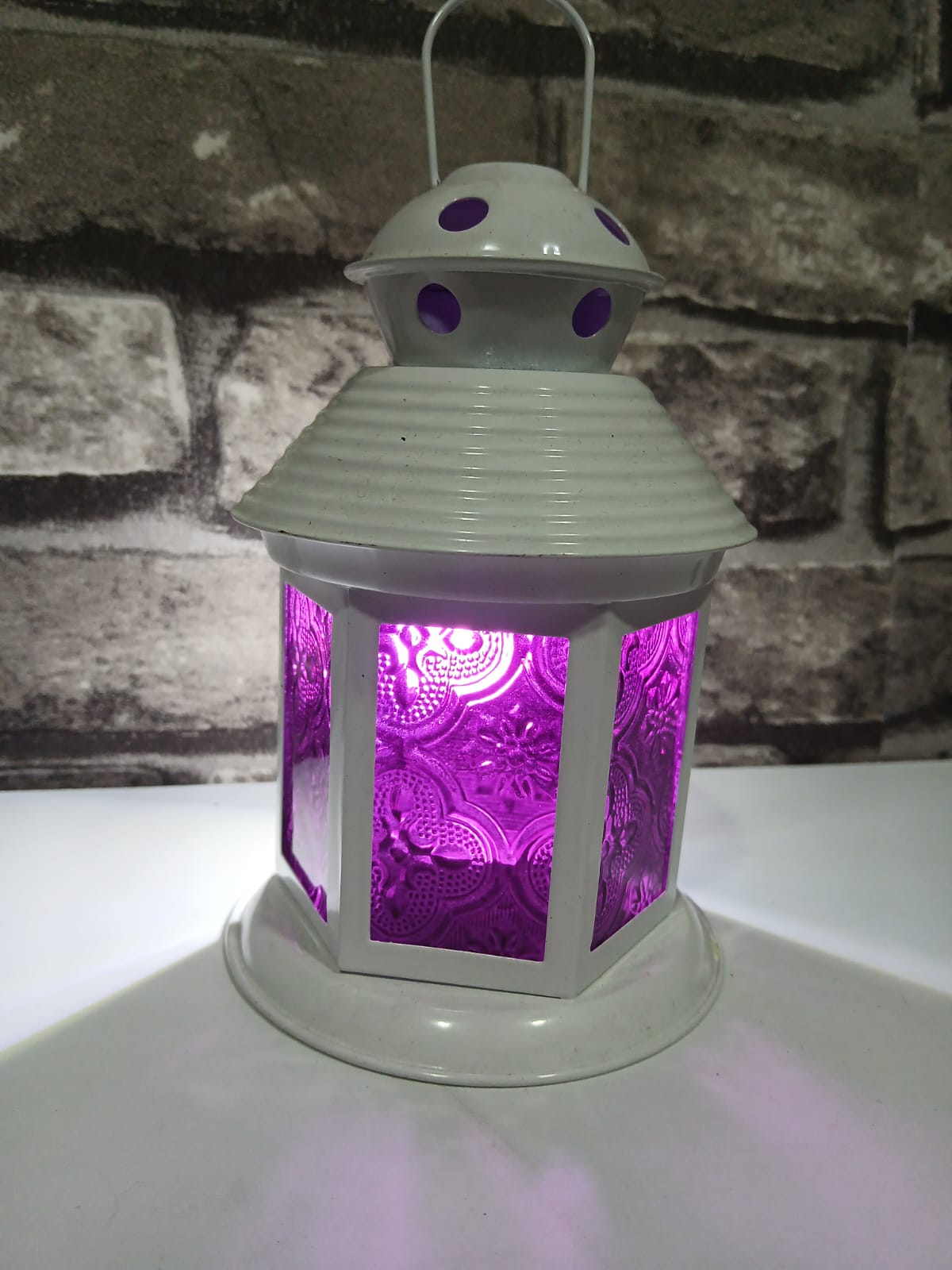 Portavelas estilo marroquí en tono blanco con detalles de cristal morado. Aporta un toque exótico y elegante con su luz suave y ambiente cálido.